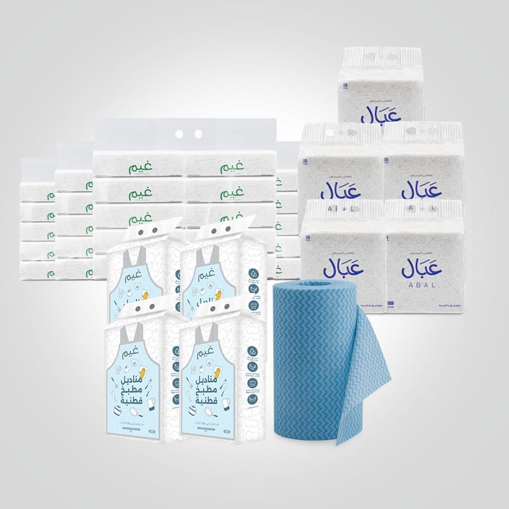 يتكون البكج من خمس عبوات مناديل عبال 1000 معلقه + 50 عبوه من مناديل 300 غيم +4 مناشف قطنيه معلق + 1 منشفه مايكروفايبر