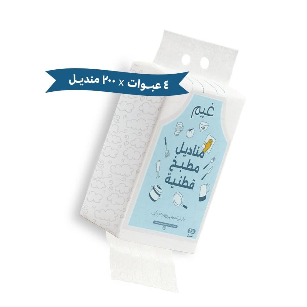 مناشف مطبخ قطنية من غيم بامتصاص عالٍ وتجفيف سريع، لطيفة على الأسطح ولا تترك وبرًا أو آثارًا. عبوة عملية تضم 200 منديل بعدد 4 عبوات و 800 منشفة للاستخدام اليومي في المطبخ والضيافة.